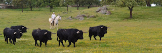 Bulls are born and raised in the countryside, in the pasture. The pasture is a big upland farm with abundant grass and trees, usually oaks. Feeding the bulls is very important. There is a lot of controls on pasture and feed. With the feed prices rising, the price of fighting bulls has risen, too, ranging now from 5,000 to 30,000 euros per bull.