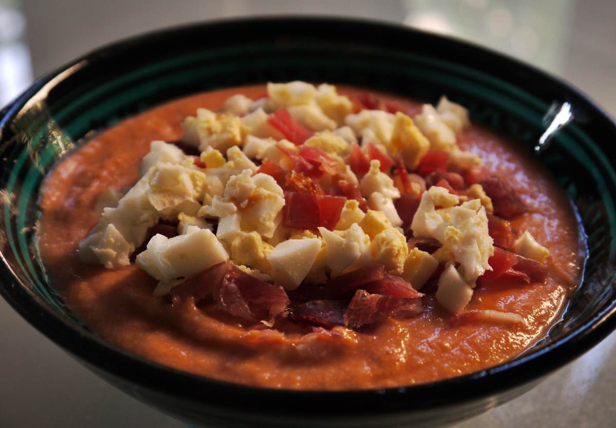 Purée the peeled tomatoes, bread, oil, one egg, garlic and salt. Sieve this cream until very fine. Slice or dice the boiled eggs and decorate with the diced Serrano ham. You can also use tuna as decoration. Finally, sprinkle with extra virgin olive oil.